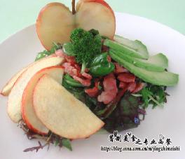 幼嫩沙拉叶100克,苹果1个,牛油果1个(又名油梨鳄梨),培根100克,油醋汁60毫升,盐和胡椒适量,法国香菜(切碎)1勺