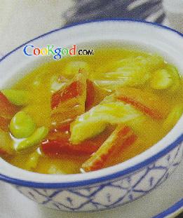 3、锅中加少许色拉油烧热,下入洋葱末炒香,再下入培根片炒至片刻,倒入8杯高汤,下入白菜、蚕豆、精盐、鸡精、柠檬汁煮10分钟,离火即可。