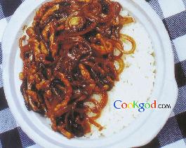泰国大米淘洗后晾干,入煲中加水蒸制成饭。肉丝、鳝丝过油,加鸡丝、火腿丝、笋丝煸炒,加酱油、白糖、绍酒、味精、鸡汤,勾芡浇盖在米饭上即可。