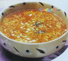 3、锅中加入肉汤,旺火烧沸,淋入蛋黄液,再烧沸,加入精盐、味精、香油推匀,浇入牛肉碗中即成。