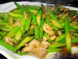 3.锅内放油烧热,下葱、姜,放肉片炒白,然后下芦笋、调料一同炒香后即可装盘食用。这个菜很好吃,很嫩,没有渣滓.