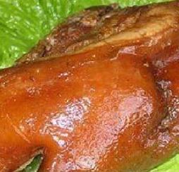 猪头泡入水中洗净,镊去细毛,割下双耳,去掉猪眼圈、嘴唇、耳圈、鼻子、脸劈成两块,下巴劈成3块,再放入水中浸泡,漂去血水。下水锅煮半小时,捞出洗净切成块。取锅上火放油,下甜面酱炒成甜酱色,加入卤汁,放入肉块、茴香、桂皮、酱油、精盐及清水,先用旺火烧沸,再用文火煮约3小时至肉酥烂即成。
