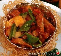 3、青椒、凤梨、红萝卜均切块入油锅内炒熟,再加调味料拌炒入味,最后加太****水勾芡,并盛出淋在炸好的芋卷上。