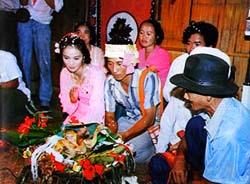 饶有情趣的傣族婚札 傣族的婚礼,民间称为“金欠”,含结婚宴请之意。婚期只能定在每年的“开门节”至“关门节”(傣历十二月十五日以后,至次年九月十五日以前)这段时间,婚礼以为新郎、新娘祝福、拴线为主要内容。