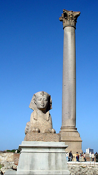 庞贝神柱也是一处不朽的难得一见的古遗址。神柱建于1600年前,为粉红色的大理石柱,柱顶顶着雕刻有花瓣的石托。大理石柱前有两座粉红花岗岩狮身人面像。据说此处遗址原为神庙,391年被基督教徒破坏,神柱则保存了下来,大概是几百吨重的大理石柱难以摇撼之故。我们现在参观时反倒经常想到巨大的大理石柱是如何搬运来又如何竖起的,即使现代,要竖起这么沉重的石柱也非容易。