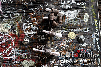 在这个院子里除了朱丽叶的塑像和阳台引人注目外,不知从何时起,院内又形成一道感人至深的新景观:大凡伸手可及的石墙上都刻写着密密麻麻的关于爱的祝福和丘比特的神箭,原本略显破烂的墙壁已然变成了一堵色彩缤纷的“爱情墙”。在那些温情缠绵的话语中,“forever”是最常见的字眼,到这里参观的人们相信爱情的巨大能量,每个人都祝福自己拥有的爱情能持续到永远。