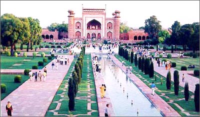 泰姬陵是印度莫卧儿王朝君主沙贾汗为他的爱妻所建的陵墓。沙贾汗的美丽皇后玛哈,在婚后的第19年,第14次生产中去世,临终前向皇上要求了4项承诺,其中一项便是建造一座人人可瞻仰的美丽陵墓。于是沙贾汗耗资500万卢比,用了2万名工匠,花了22年时间,在当时莫卧儿帝国的皇宫红堡的对面、朱穆那河的河边,完成了这座震惊世人的白色大理石建筑。这位皇帝甚至计划再为自己修建一座相对应的黑色的陵墓,以示永世相守。然而他的长子阴谋篡位,将他软禁在红堡。晚年失去帝位的他,只能天天坐在红堡的走廊上,凝望着不远处的泰姬陵,在思念妻子和失去自由的痛苦中了却残生。所以,红堡和泰姬陵是所有到印度旅游的人都要朝拜的名胜。阿格拉市的红堡是由莫卧儿帝国多位君主先后修建的,也是世界上最著名的宫殿,然而人们赶到这里,最重要的还是走进沙贾汗的房间,透过镂花的大理石窗,眺望朱穆那河对面的泰姬陵,遥想一下当年国王悲苦的心情,之后再前往泰姬陵,参观这座被《美国国家地理》杂志评为“世界上50个必去之地”的圣墓。