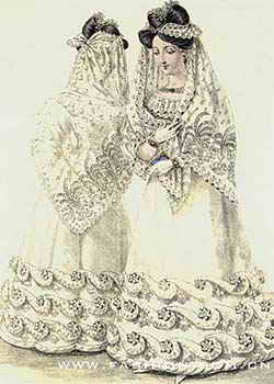 1836年的婚礼服 缎子礼服上在罩上蕾丝做的连衣裙,前面A字形打开的形式是文艺复兴和洛可可女装样式的再现。
