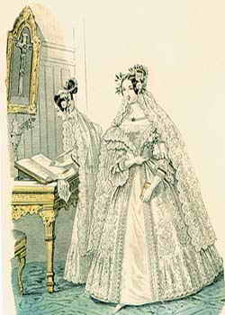 最初的婚纱,设计不很复杂。垂直线条的高腰长裙,有褶的袖子和开得较低的领口,仿佛就是当时流行服装款式的翻版。丝和缎是婚纱的主要面料。后来的婚纱款式是长及足踝的,前幅裙用直线剪裁,后幅则缀上另一幅拖地的裙摆,当新娘走在教堂的红地毯上时,拖地的裙摆也在地毯上徐徐而过,令新娘有天仙般的风姿。以后的婚纱式样,上紧下宽,低领口被端庄的高领所取代,质料多用华丽的锦缎,领口、袖口和裙摆还缀上了不少花饰。至19世纪末叶,婚纱的质地渐趋轻柔,双绉纱与塔夫绸最受新娘们的青睐。