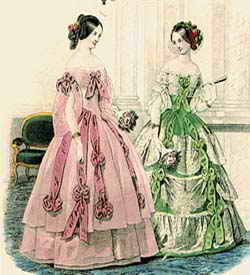 1846年的婚礼服 坦胸露背的低领口装饰着大缎带蝴蝶结和层层蕾丝,花束、手镯和优美的扇子是晚会上不可缺少的饰品。