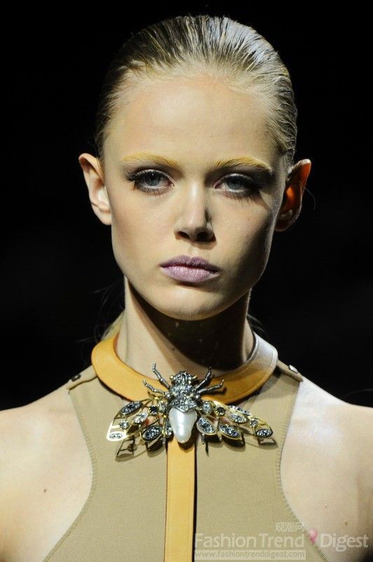 花卉与动物主题 延续上季秋冬,设计师在11春夏再次带来了自然界灵感的图案。森林动物如猫头鹰、狐狸和兔子等都是关键的趋势,具有动画般的天真纯朴感。被加入了金龟子彩虹色的昆虫型珠宝,如我们在Lanvin中看到的;此外花卉、树叶、树枝在胸针、项链、手镯等单品中也同样重要。