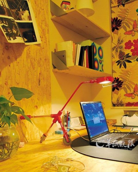在客厅的另一边,设计了一个靠墙的办公桌,宽大的桌子可以放置很多东西,办公桌上有两块小隔板,用于放置一些常用书刊和资料等,成为工作区(图3);在工作区旁边放置一张小圆几和一张躺椅,就是休闲区,可以看书、听歌,得到初步的休息(图4);在与工作区正对的墙壁,设计了一个靠墙的大书柜,相当于书房,并不是用实体墙间隔(图5)。
