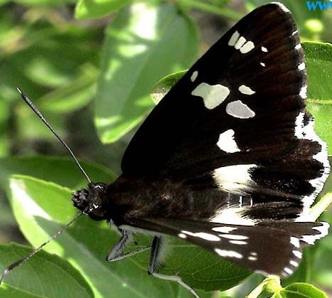 翅面黑色,斑纹和缘毛均为白色。前翅顶角处有3个斑纹,其下侧有2个极小的斑点,中域还有5个大小不等的白斑排列。在水边的湿地或旁边枝条上停歇。翅展25--41mm