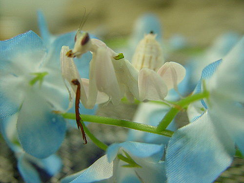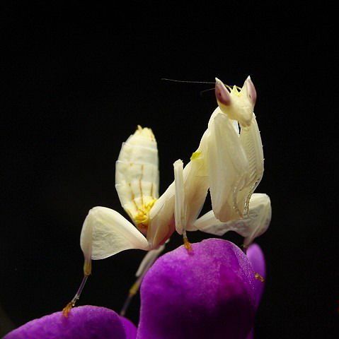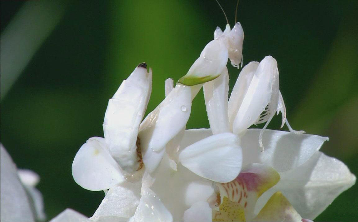 是世界上进化得最完美的生物,在很多不同种类的兰花会生长着各自的兰花螳螂,它们有最完美的伪装,而且能随着花色的深浅调整自己身体的颜色。兰花螳螂该算是螳螂目中最漂亮抢眼的一种了。它们的步肢演化出类似花瓣的构造和颜色,可以在兰花中拟态而不会被猎物察觉,最适合螳螂守株待兔的掠食方式,也算是最高明的掠食者之一。