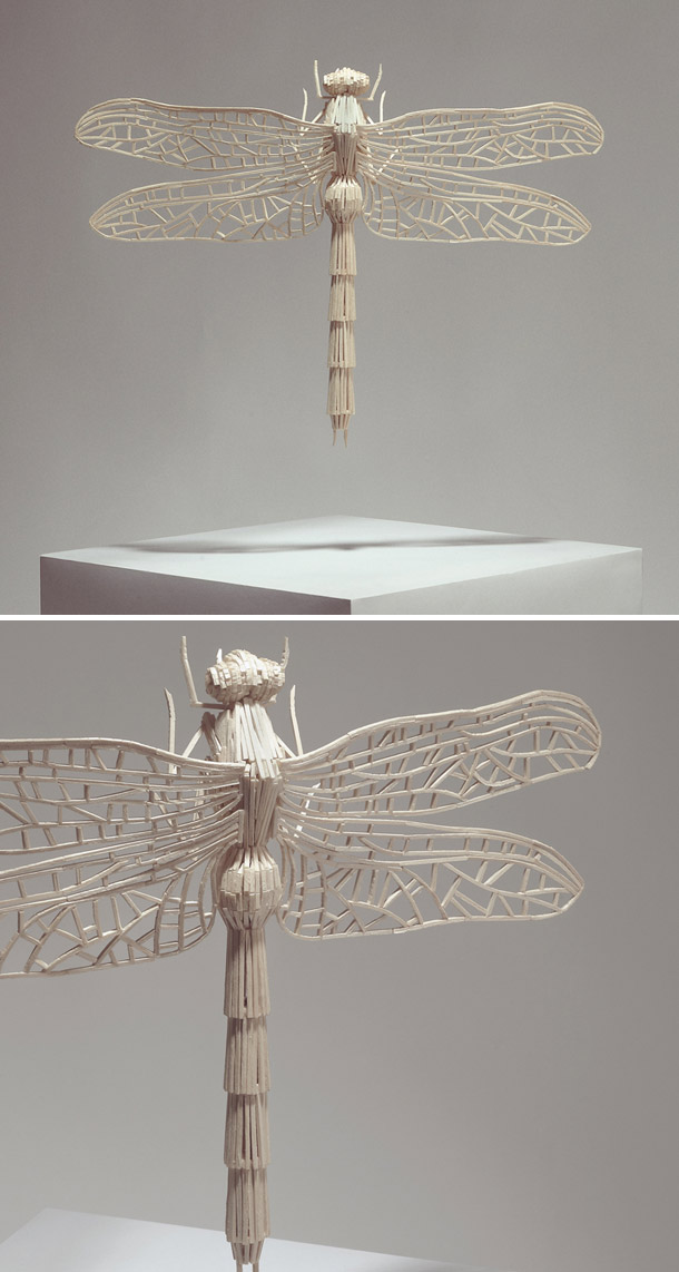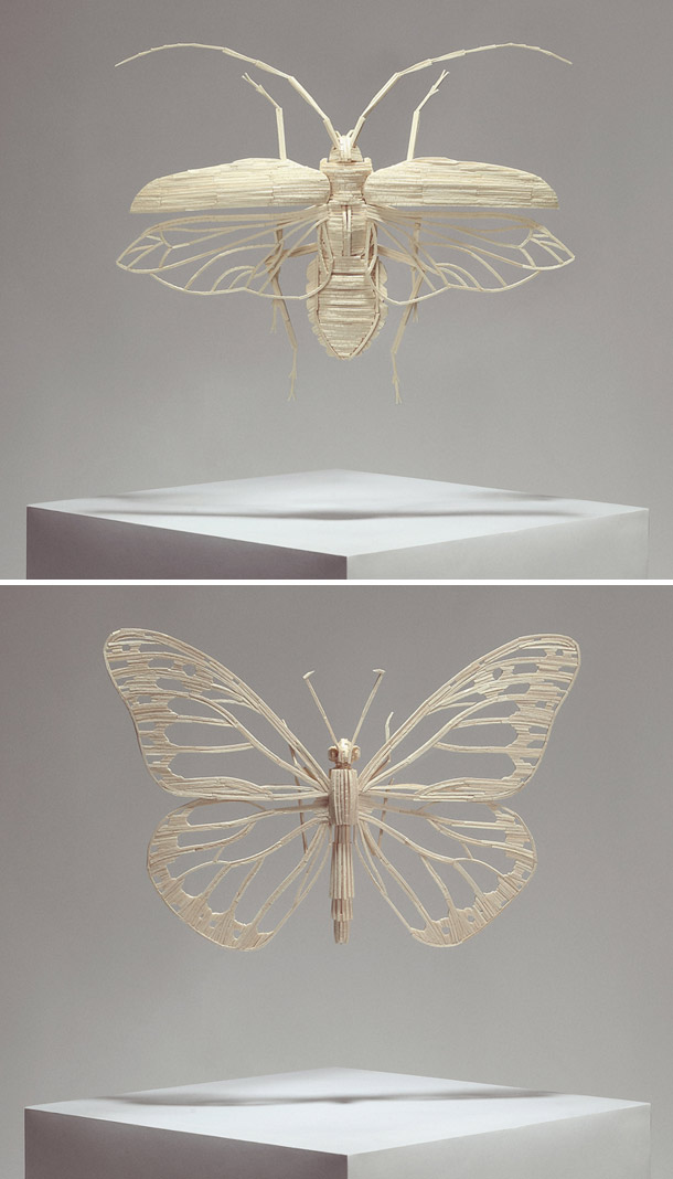 设计师KyleBean利用日常生活中简单的火柴,制作出这些美丽的昆虫,蝴蝶、蜻蜓等等,燃烧的部分去掉了,并且也折的一截截拼在一起。