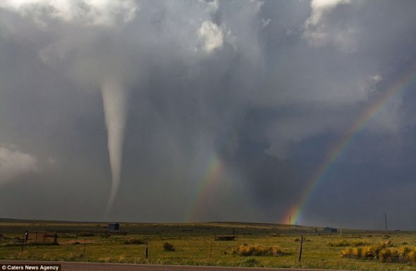 北京时间2月27日消息,据国外媒体报道,在美国科罗拉多州的空中,美丽的彩虹邂逅凶猛的龙卷风,制造出一幅惊人画面。这种现象非常罕见。