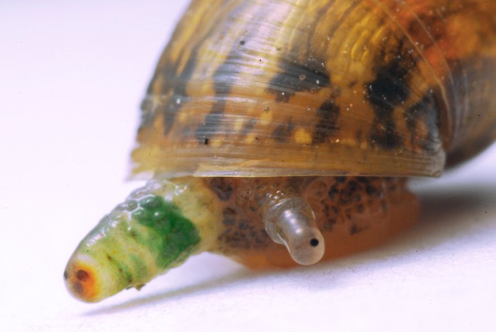 图中蜗牛身体上有一部分可能会被许多人误认为是蜗牛的触角,其实这根本不是触角,而是一种名为Leucochloridium paradoxum的双盘吸虫。这种寄生虫可以进入蜗牛的消化系统,并长成一条长长的管,其中充满了数百只有生死能力的尾蚴。接下来,长长的管道入侵蜗牛的触角,形成一种怪异、肿胀、跳动的外观,以此来吸引鸟类的注意。鸟类吃下这只蜗牛后,就会变成寄生虫成长第二阶段的宿主。虫卵通过鸟类的粪便排出到植物上后,又会寄生到其他蜗牛身上,继续开始它们的生命轮回。
