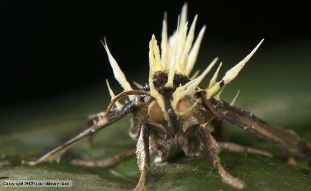 本图中蚂蚁的头部长出了一朵蘑菇。这种奇怪的现象是由一种名为Cordyceps的寄生菌所致。寄生菌感染蚂蚁的大脑让其变成僵尸蚂蚁,然后驱使僵尸蚂蚁前往最适宜真菌生长和传播的场所,最后再杀死蚂蚁。研究人员认为,全球热带雨林中可能有数千种此类真菌。