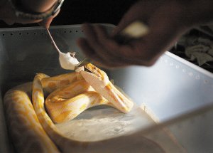 “我的蛇每周都要洗澡,蜕皮期还要多洗几次。”李同学很喜欢养宠物,苦于学校宿舍不让饲养小动物,李同学最终买了条蛇当宠物。“因为蛇不会出声,平时只要关好就行。”李同学说,照顾这条蛇,他可是拿出了平时照顾女朋友一倍的耐心,定期为蛇洗温水澡,密切观察它的身体变化。