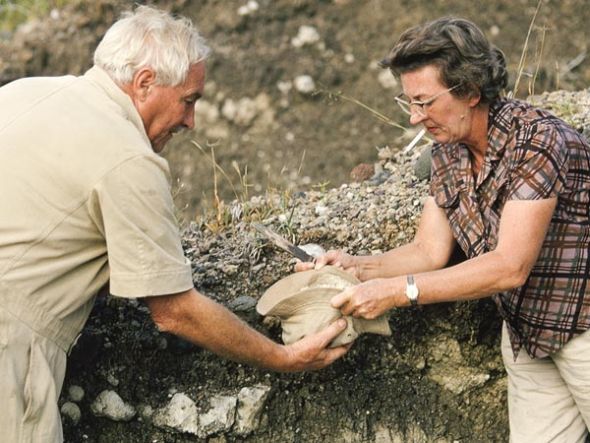 照片在肯尼亚拍摄,古生物学家玛丽-利基和路易斯-利基夫妇正在分析化石。利基夫妇一直致力于寻找早期人类证据,他们的儿子和儿媳——理查德-利基和莫维-利基以及他们的孙女路易丝-利基也投身于这一研究领域。从1960年开始,利基夫妇共获得国家地理学会提供的76笔资金。弗朗西斯说:“我们长久以来一直向利基家族提供资金,资助他们进行研究。他们的研究发现是一份宝贵的遗产,加深了我们对人类起源的了解。”
