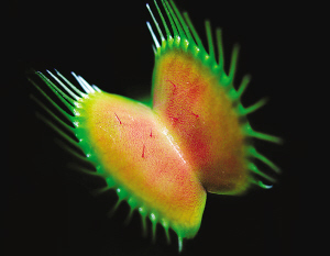 捕蝇草的构造的确比较简单,它身体最突出、最主要的部件就是那个捕虫夹,而捕虫夹分为两片,合起来就可以把虫子包裹住。捕蝇草怎样知晓靠近的虫子呢?原来,捕蝇草的捕虫夹内长了几对细毛,这就是它的感受器。一旦虫子踩到这些细毛上,捕蝇草就合起来,叶片边缘的长须也交错在一起,并分泌黏液防止虫子逃跑。捕虫夹内侧密布许多小红点状的消化腺,可以把虫子慢慢消化掉。