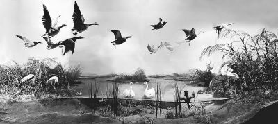 鸟类展厅 鸟类以其飞翔的本领成为脊椎动物中很特殊的类群。展厅通过标本、文字、视频和图表告诉我们,它们是如何进化出了一系列适应飞翔的特征。世界上有1万余种鸟类,我国分布有1400多种。为了研究鸟类,人们主要根据生理特征对鸟类进行系统分类。而通常情况下,人们根据鸟类的生态类群和生活习性将它们分为:猛禽、游禽、涉禽、攀禽、鸣禽和陆禽。展厅中不仅展示了它们的形态,观众还能通过自己操作特别的设备,听到它们不同的鸣叫。我国特有鸟类资源丰富,很多雉类为我国独有,如白冠长尾雉、红腹锦鸡、血雉、马鸡等,具有很高的观赏价值。鸟类为适应不同生活环境和取食特征而进化出相应生理特征,如游禽的脚趾间都有蹼且有发达的尾脂腺以适应游泳生活,秃鹫和高山兀鹫为适应埋头吃腐尸的习性而在脖子基部长了一圈作用类似餐巾的长羽毛。鸟类为了繁殖更是使尽了招数。展厅中还展出了多种鸟类绚丽多彩的羽毛、大小形态各异的鸟卵、形状材料不同的鸟巢。