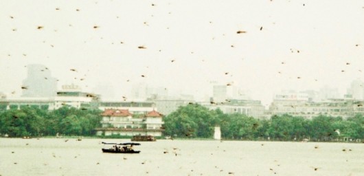 昨天上午,天空还是万里无云,艳阳高照。在西湖白堤的草坪上,却低低盘旋着一群群密密麻麻的蜻蜓。“跟白堤蜻蜓合影”成了游客的新节目。