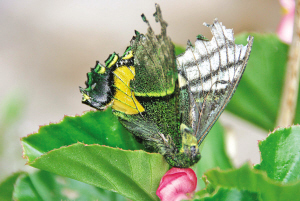 昨天上午,保护区工作人员在野外巡护中发现金斑喙凤蝶。