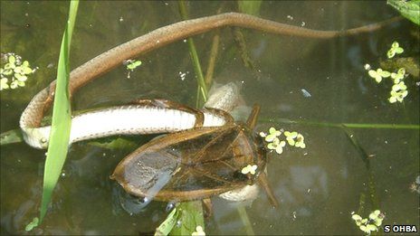 大庭伸也在《昆虫学》杂志上写道,他注意到一只Kirkaldyia deyrolli正在稻田边的水沟里吃一只草龟。它用前爪紧紧抓住小龟,把像管子的喙插入猎物的脖子。过去大庭伸也还拍摄到水蝎吃蛇的画面。他说:“所有人都认为Lethocerinae以鱼和青蛙为生。尽管它们吃蛇和乌龟的画面在自然环境下并不常见,但是(这个证据)令博物学者感到很吃惊,它显示了水蝎贪婪的摄食习性。”