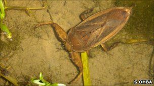 据英国媒体报道,大庭伸也(Shin-ya Ohba)博士夜间在日本兵库(Hyogo)西部地区取样时,拍摄到一只巨大的水蝎正在进食小龟的画面。众所周知,属于Lethocerinae家族的这种虫子主要捕食体型较小的脊椎动物,例如小鱼和青蛙。但是它们不喜欢昆虫,经常捕食爬行动物,科学家曾观察到其中一种水蝎正在吃蛇和海龟。