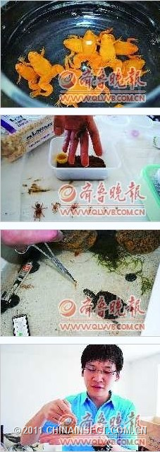 “我现在养的主要有两只火玫瑰蜘蛛、一条越南巨蜈蚣和三只白玉蜗牛,另外还有巴西龟和陆龟各一只。”5月3日下午,在崔宏杰的宿舍里,崔宏杰向记者介绍着自己现有的“养殖规模”。“先前我养的动物更多,蜥蜴、蜘蛛、蜈蚣等各式各样的,都叫我养死了。”据崔宏杰介绍,由于经验不足,在2010年冬季时,崔宏杰豢养的包括两只绿蜥蜴、一只“红玫瑰”蜘蛛在内的多种爬行动物先后“暴毙”,着实让崔宏杰心疼了一段时间。崔宏杰说道:“去年可能是加热垫太热了,把它们闷死了。”