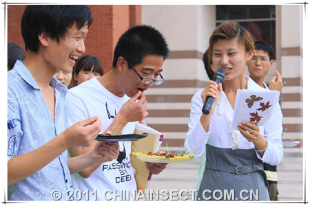 文学院美女王丹尝试了黑蝉,连连夸奖说,“口感不错”,还满怀兴致地为黑蝉做了广告:“我黑我健康,我黑我快乐,味道真不错,你值得拥有!”机械学院一女生主动提出要挑战大豆虫烹制的“豆天蛾”,入口之前,手一直发抖,她无奈、难受的表情十分幽默,让吃虫现场的气氛很热烈。