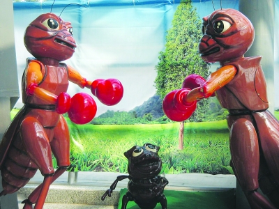 这场名为“虫虫总动员”的展览,以卡通昆虫为主题,主角们是放大版本的各类昆虫,高达2米多,身体结构、造型、色彩均按真实生物仿制,生动可爱。此次展览一改以往单纯的展出方式,运用拟人手段,通过“蟋蟀拳击赛”、“蚊子的对白”、“蟑螂偷油”等情境组合,以充满童趣的方式展示自然界中庞大的昆虫群体。