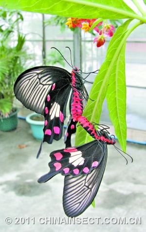 詹天佑小学蝴蝶饲养园内的红珠凤蝶在交尾。
