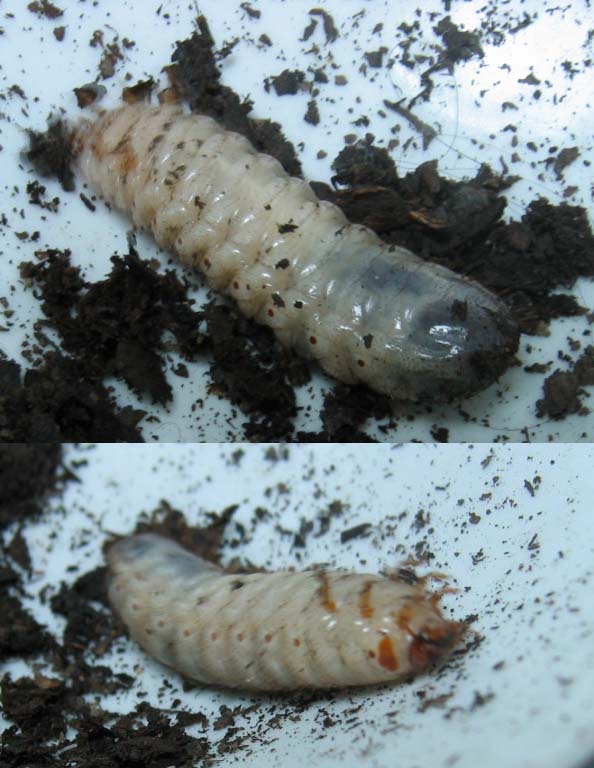 花生、地瓜成熟收成的时候,或者平时翻地种作物的时候,能从泥土里翻出来不少的虫子,最常见到、也最引人注目的是一种个头很大的乳白色的虫子,它就像一只生活在地底下的白嫩肥大的蛆。它通常都弯曲着身子,头部是深褐色的,嘴及周围还有硬壳一样的东西,嘴长得硬是为了在泥土里吃东西方便吧,身体是乳白色或者淡黄色的,看着软绵绵的,身上还长有几对弯曲在腹部的脚,身体表面有细细的绒毛,又像是地底下的一只肥白而没有翅膀的大蝉,有些腹部那里还半透明状,看得到肚子里灰黑色的一团,总之它的样子很吓人,也非常令人恶心。
