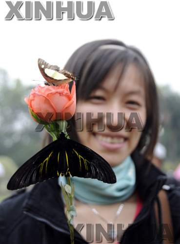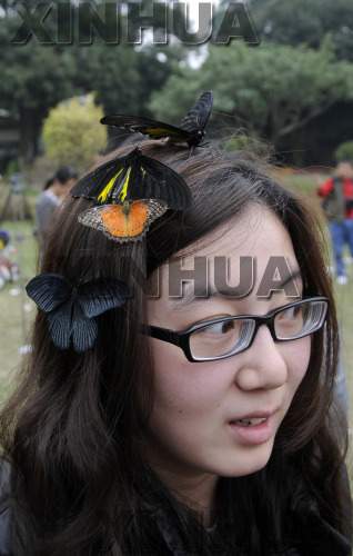 3月8日,几只蝴蝶飞落在一名女士的头发上。