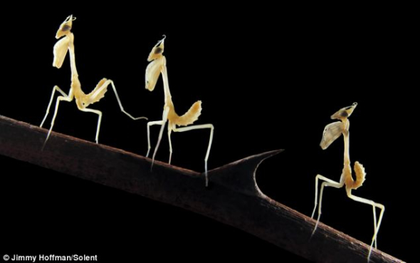 球根状的鼓鼓眼睛和奇特的枝条状身体,这些螳螂看上去像是来自另一个星球的生物。在一张照片中,它们栖息于细小的植物根茎之上,享用着黄色蚜虫这顿午餐;在另一张照片上,一只螳螂正欲扑向一只毫无防备的蝴蝶;还有一张不可思议的照片甚至显示螳螂幼虫看上去不比一根玫瑰刺大多少。