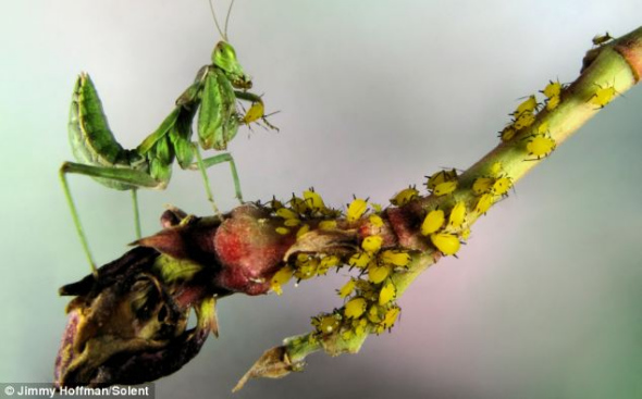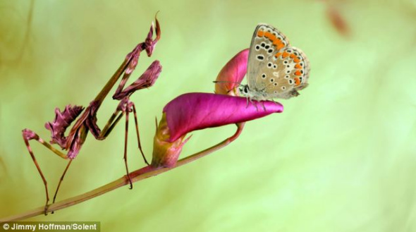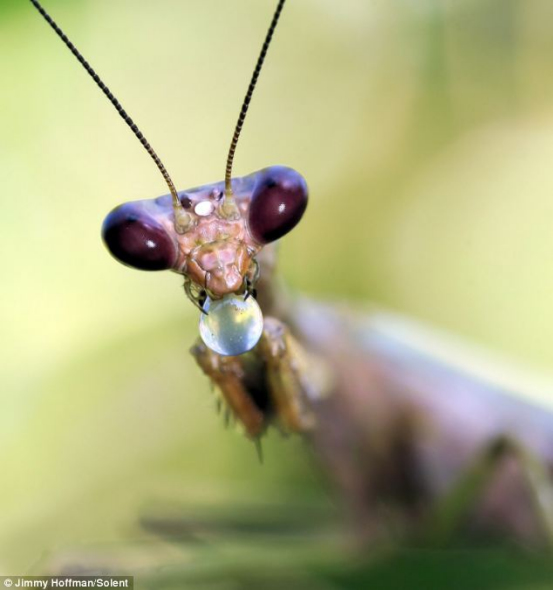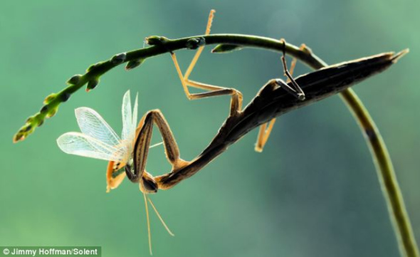 虽然螳螂面目可憎,看上去很邪恶,霍夫曼在拍摄螳螂的过程中从未被其伤害过,但他承认,一位朋友在拍摄螳螂时,遭到螳螂的攻击。