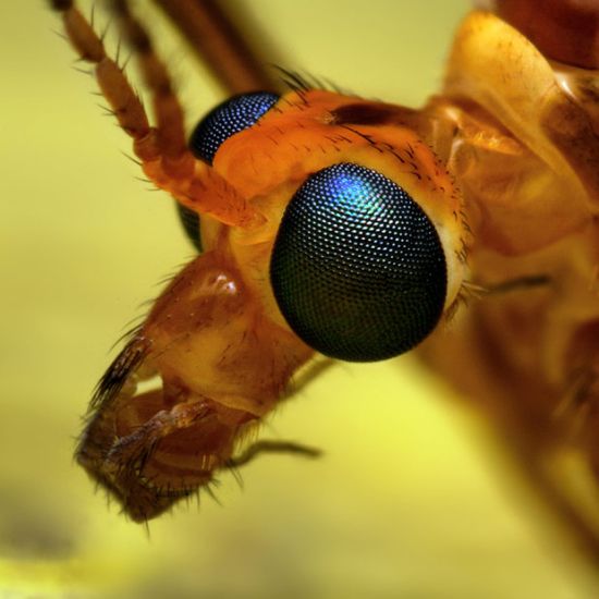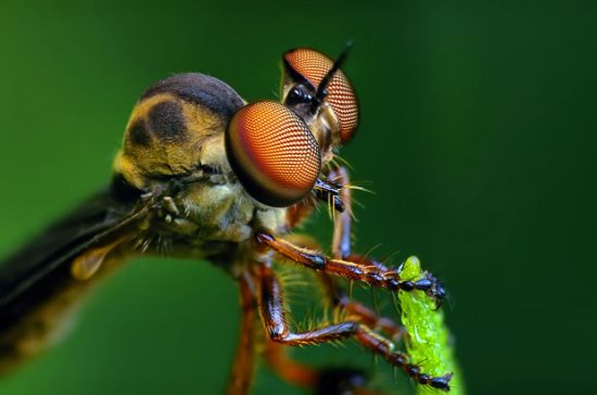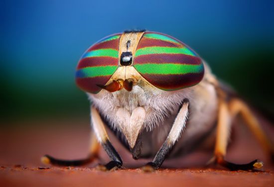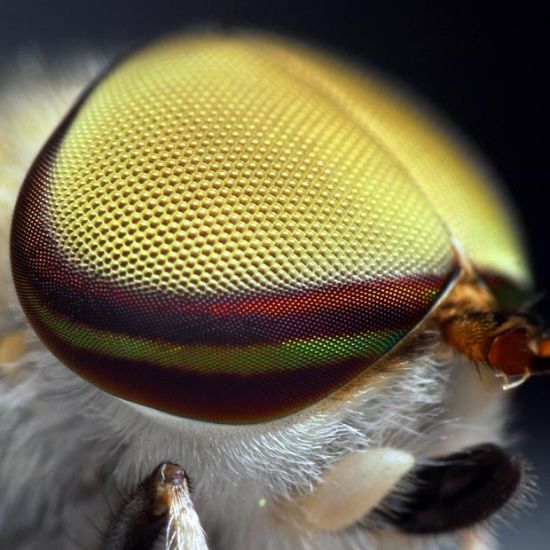 这是一只食虫虻的眼睛。托玛斯的拍摄对象很广泛,从跳蛛、蜻蜓,到食虫虻、马蝇等等。