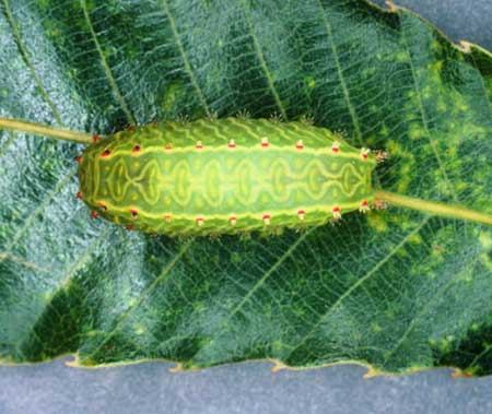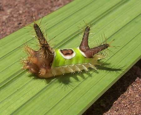 巨斑刺蛾的幼虫会蜕变几次,从最开始的深棕色,经过橙色、古铜色,最后变成这种绿色。它的背上也有毒毛。