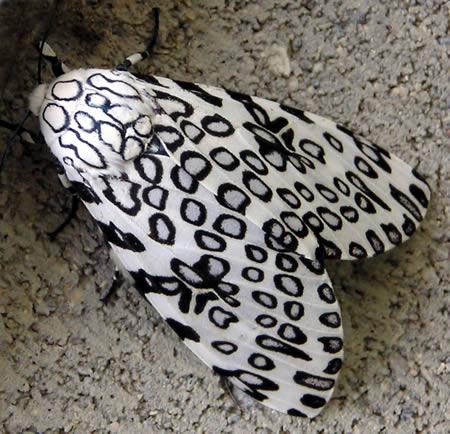 体型巨大的豹蛾或虎眼蛾学名“Hypercompe scribonia”,其翅膀上生有独特的黑环图案,好似美洲豹身上的豹纹。图片中这只豹蛾翅膀上的清晰图案是一种警戒色,形象地说就是在做广告,警告潜在捕食者“我们并不好吃”。