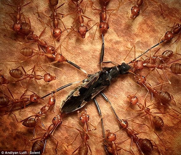 一只倒霉的飞虫在擅闯蚁穴后,立即遭到大群红蚁围攻。这张微距照片是由印尼业余摄影爱好者安迪亚恩·鲁特菲在自家花园拍摄的。