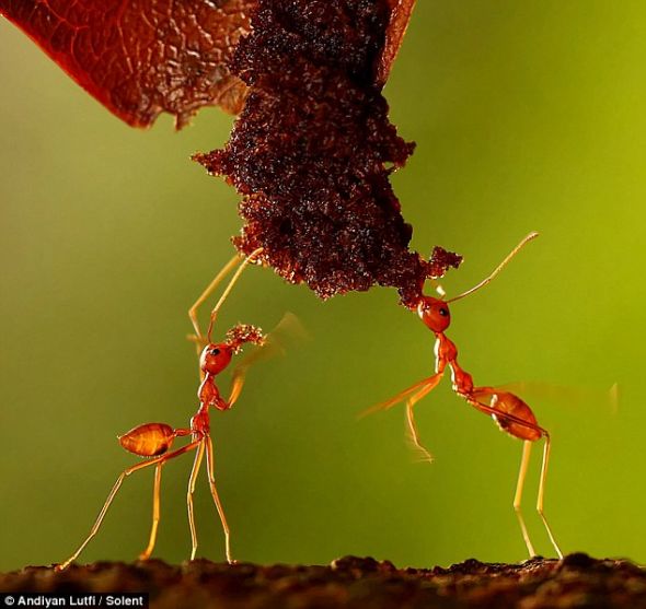 这些小家伙似乎够不着核仁巧克力饼——一只蚂蚁为了咬上一口,用后腿将整个身子撑起来,与此同时,它的同伴则是享用美味的巧克力。37岁的鲁特菲说:“我在自家花园拍了这组照片——蚂蚁们栖身于芒果树底端。我经常看到它们辛勤工作的镜头,真是太令人不可思议了。人们之所以对这些照片如此惊讶,是因为每一张似乎都讲述了一个故事。”