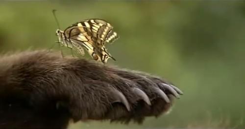 还有一些镜头将熊这种猛兽与美丽的大自然融为一体,似乎想体现在大自然的怀抱里,每个生命都有生存的权利,都有温顺的一面,这种超脱的状态有种庄子中的出世意味。正像影片结尾处出现的一句话:The greatest thrill is not in killing, but in letting live.最震撼人心的不是捕杀,而是给予生存的权利。每个生命都应该得到尊重,应该像对待人类的生命一样,去对待每一个动物。
