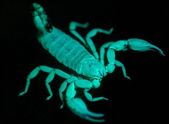 道格拉斯在《动物行为》杂志上撰文说:“蝎子多数喜欢独居,是一种具有夜间习性的蛛形纲动物。在紫外线照射下,这些动物都能发出明亮的绿色光。这种荧光功能十分神奇,科学家一直以来都没有揭开它的神秘面纱。”