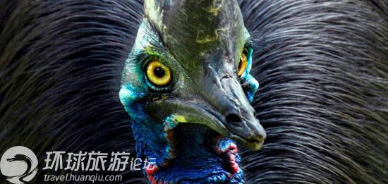 普通食火鸡体高1.5-1.8米(最高可达2米),头顶上有角质的黄冠,喉下有赤红色的肉垂,嘴扁,灰黑色,全身已羽毛下垂,黑色,翅膀很小,不能飞,脚发达,善走。捕食真菌类、蜗牛、昆虫、青蛙、蛇和其他小型动物。