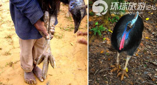 食火鸡的脚有三趾,每趾都有锋利的爪。中趾的爪就更像****,长120毫米。这爪特别危险,因食火鸡只要一踢就可以用它来杀死敌人或除去肠子。它们可以以时速50公里穿越密林,利用头上的骨盔推倒小树及丛林。牠们可以跳跃达1.5米高,且是游泳能手。