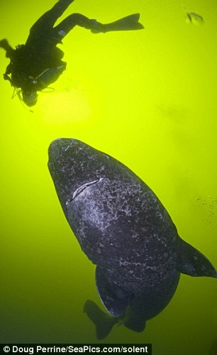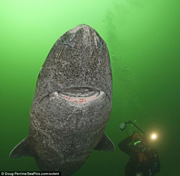 勇敢的美国摄影师道格-普利纳拍摄了一组水下照片,展现一种罕见的格陵兰鲨鱼,皮肤好似遭到侵蚀的石头。格陵兰鲨鱼的寿命超过200岁,最深可潜到北极海冰下方600米。它们的身长超过大白鲨,可达到23英尺(约合7米),生性凶猛,会捕食北极熊。