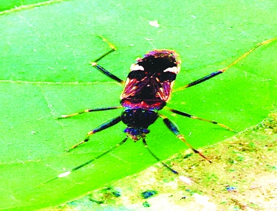 昨天上午,记者接到市民伍先生的报料称,在南京下关狮子山上,一片树叶上的一只昆虫,竟然酷似一名老汉。记者看到,这只昆虫长4厘米,宽2厘米,约有蚕豆大小,长有6条腿,还有两个触角,而它的一圈圆形翅膀上面,有类似山东老汉的图案,清晰醒目,金光闪闪。