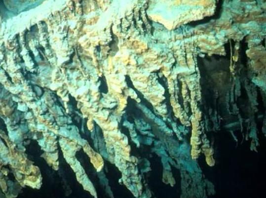 这种独一无二的嗜锈菌(rust-loving bacteria)是在沉入大海的“泰坦尼克(RMS Titanic)” 号的残骸上发现的,图上显示的画面是在深达1.26万英尺(3.84公里)的水下。这种细菌以氧化铁为食,因此它们对“泰坦尼克”号沉船没有好处:嗜锈菌贴附在沉船表面,形成球形突出物,慢慢侵蚀“泰坦尼克”号。